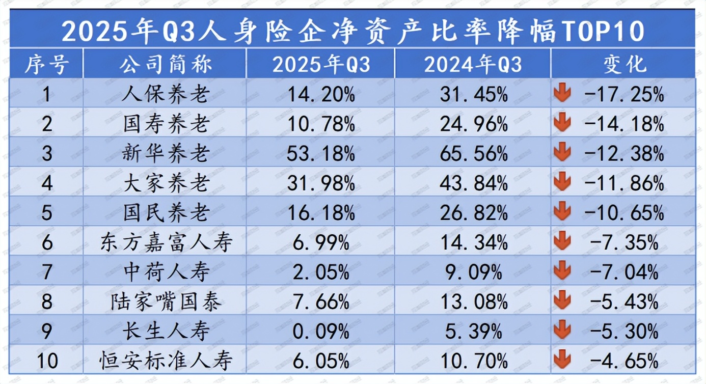 与2024年Q3相比,2025年Q3净资产比率下降TOP10的险企中,养老保险公司占据前五。这或意味着,虽然养老保险公司净资产比率基数较高,但正因业务扩张持续消耗中。