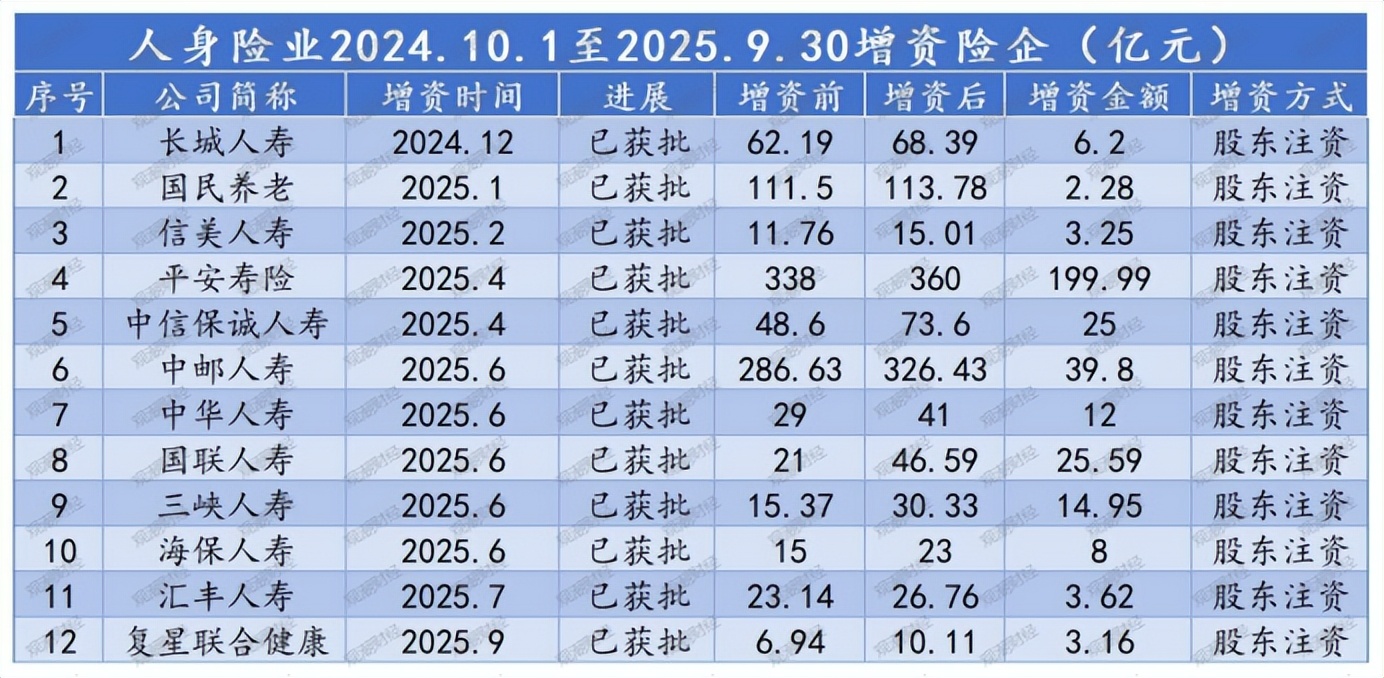 值得一提的是,上述险企中,国联人寿、三峡人寿、海保人寿、中华人寿、复星联合健康、中邮人寿、平安寿险等7家险企均在2025年获批增资。