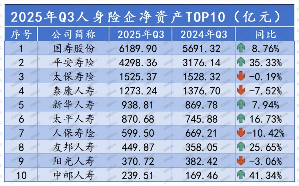 净资产TOP10:中邮上榜,中邮、平安、友邦、太平增速显著