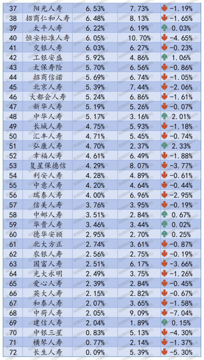 其中,中银三星人寿、中荷人寿、横琴人寿、国富人寿降幅均超50%。
