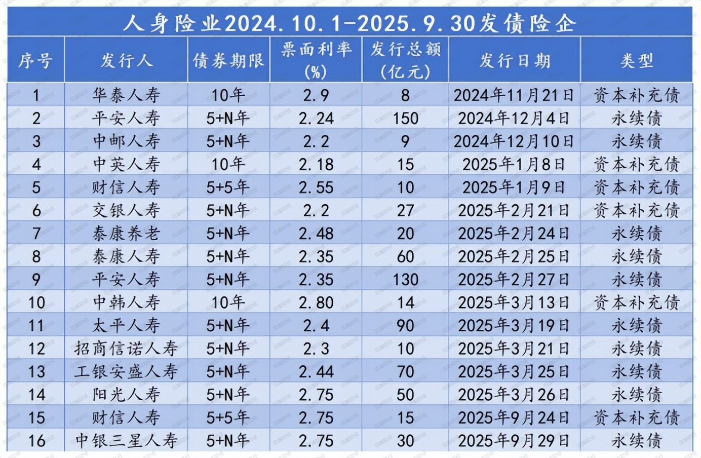 此外,据观潮财经不完全统计,2024年10月1日至2025年9月30日期间,共有16家险企发行债券补充资本,除平安、中邮、阳光、太平等外,其余均为中小型险企。