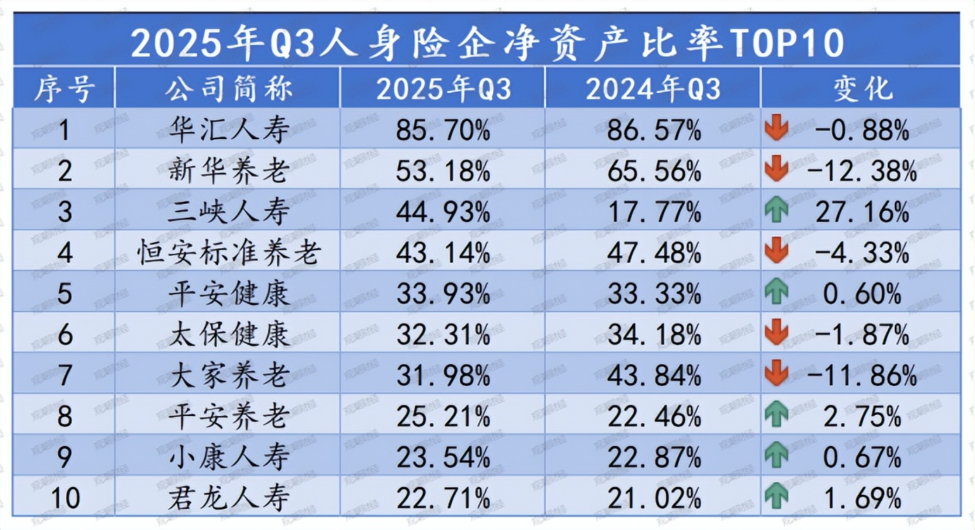 从2025年Q3净资产比率排名前十来看,有4家寿险公司、4家养老保险公司、2家健康险公司,这与不同类别险企业务结构有关。
