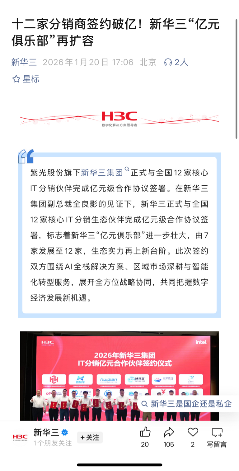 $紫光股份(SZ000938)$ 紫光股份旗下新华三集团正式与全国12家核心IT分销伙伴完成亿元级合作协议签署。在新华三集团副总裁全良影的见证下,新华三正式与全国12家核心IT分销生态伙伴完成亿元级合作协议签署,标志着新华三“亿元俱乐部”进一步壮大,由7家发展至12家,生态实力再上新台阶。此次签约双方围绕AI全栈解决方案、区域市场深耕与智能化转型服务,展开全方位战略协同,共同把握数字经济发展新机遇。
