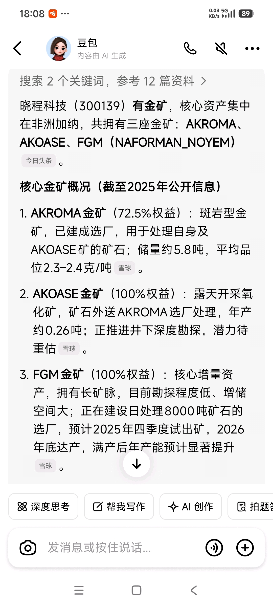$晓程科技(SZ300139)$ 晓程科技(300139)有金矿,核心资产集中在非洲加纳,共拥有三座金矿:AKROMA、AKOASE、FGM(NAFORMAN_NOYEM) 。