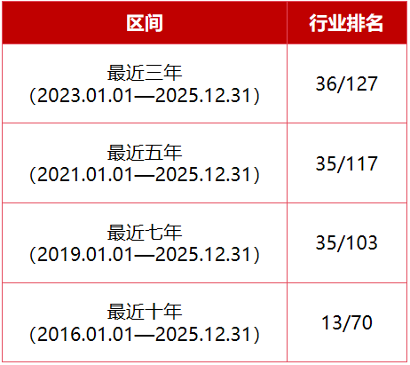这种理念体现为一种“克制中的进取”,努力让风险调整后的收益曲线更加优美。国泰海通证券基金评价与研究中心发布的《基金公司权益及固定收益类资产业绩排行榜》显示,截至2025年12月31日,东方红旗下偏债类基金的收益率最近三年、最近五年、最近七年和最近十年在同行排名中均较为出色。
