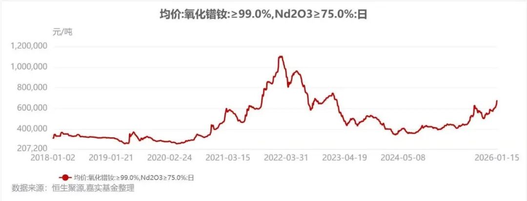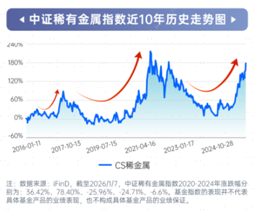 从资本市场表现看,自2025下半年起来稀有金属板块持续走强,中证稀有金属指数近一年涨幅117.07%,有开启新一轮景气周期之势(数据来源:iFinD,截至2026/1/13)。