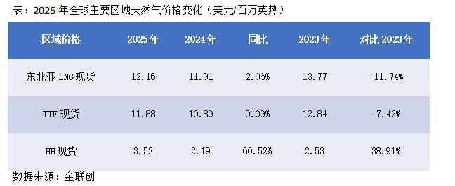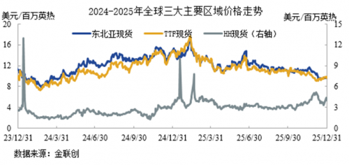 2025年国际天然气市场受全球经济温和复苏、可再生能源替代加速及美国LNG出口产能提升的影响,供需基本面紧平衡,地缘政治边际效应减弱,国际天然气价格低位震荡,现货贴水频繁出现。2025年全球三大主要区域价格集体上涨,但欧洲和东北亚作为主要进口区域,在需求增加有限的支撑下价格小幅上涨;而美国作为出口市场,在其LNG出口能力大幅提升下价格明显增涨。具体表现为:东北亚LNG现货到岸价、欧洲TTF现货价格、美国HH现货价格均值分别为12.16美元/百万英热、11.88美元/百万英热、3.52美元/百万英热,同比分别上涨2.06%、9.09%、60.52%。