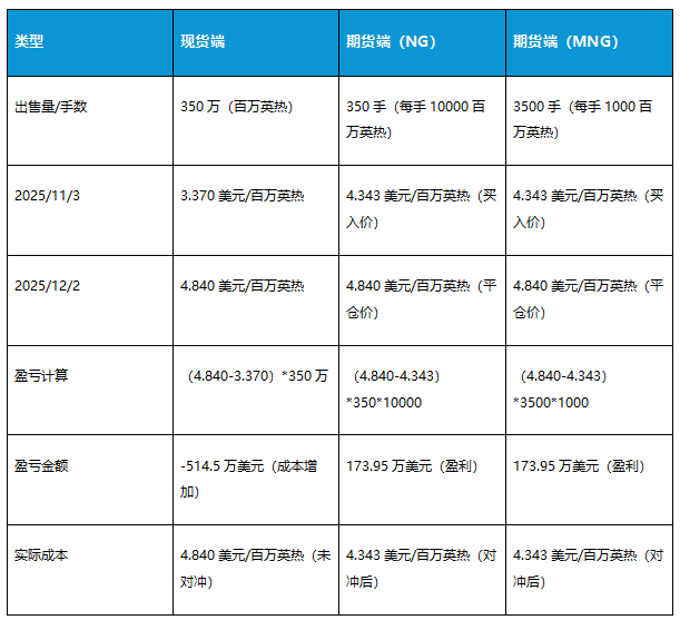 假设在未对冲的情况下,12月2日现货价格可能较11月2日上涨,进口商将面临采购成本增加的风险。为规避这一风险,进口商决定在11月2日买入NG或MNG期货合约,以锁定采购成本。