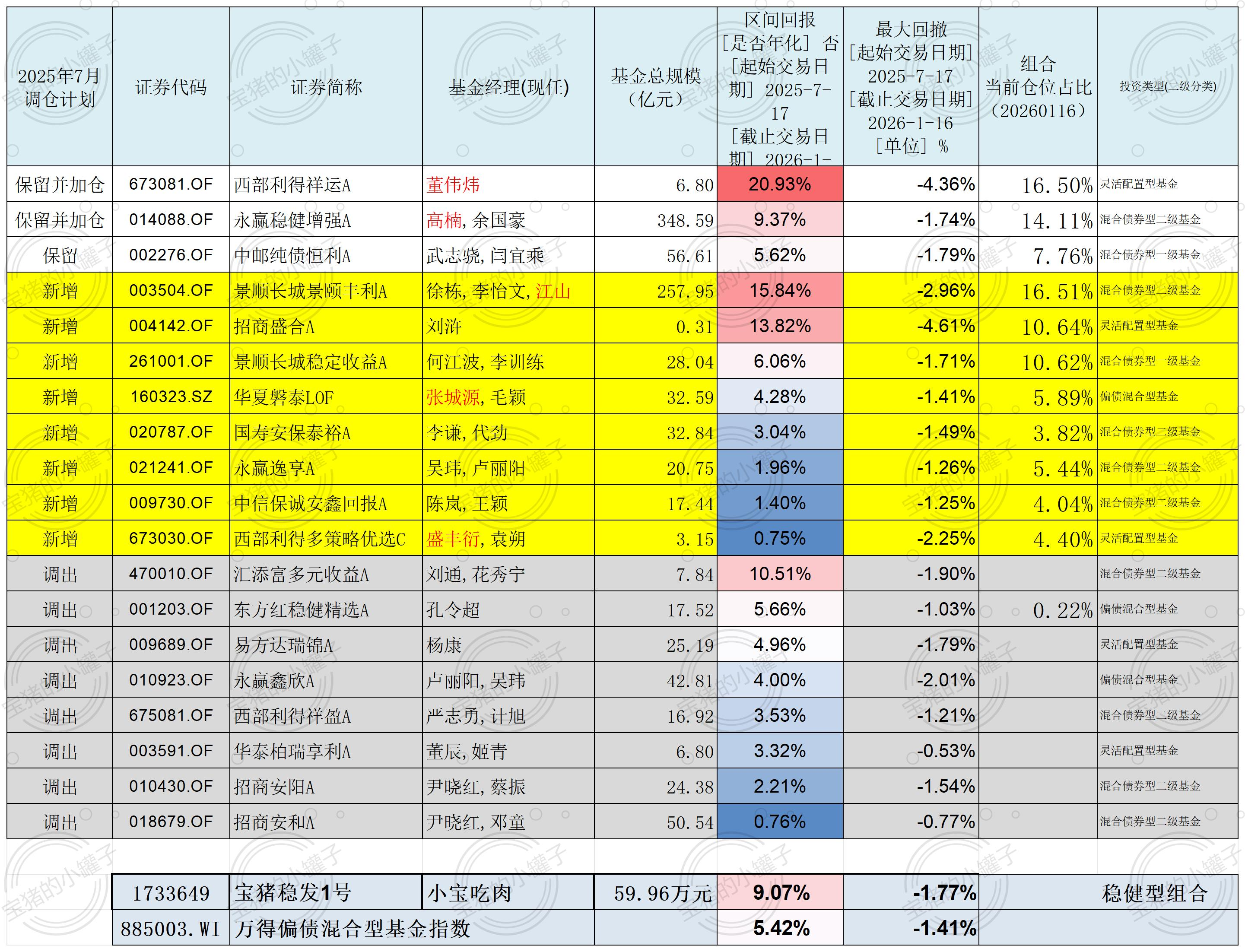 成功的案例是保留并加仓董伟炜的西部利得祥云和高楠的永赢稳健增强,新增江山的景顺长城景颐丰利和蔡振的招商盛和(刘浒20250922上任、蔡振20251215离任)。