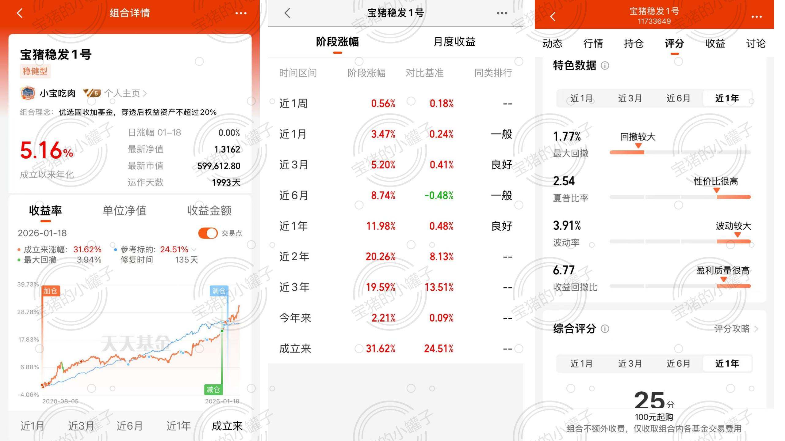 整体运作1993天(2020.8.5-2026.1.18),单位净值1.3162,年化收益率5.16%,近1年最大回撤1.77%。(请忽略天天基金的评分和文字描述,不明白它怎么出来的)