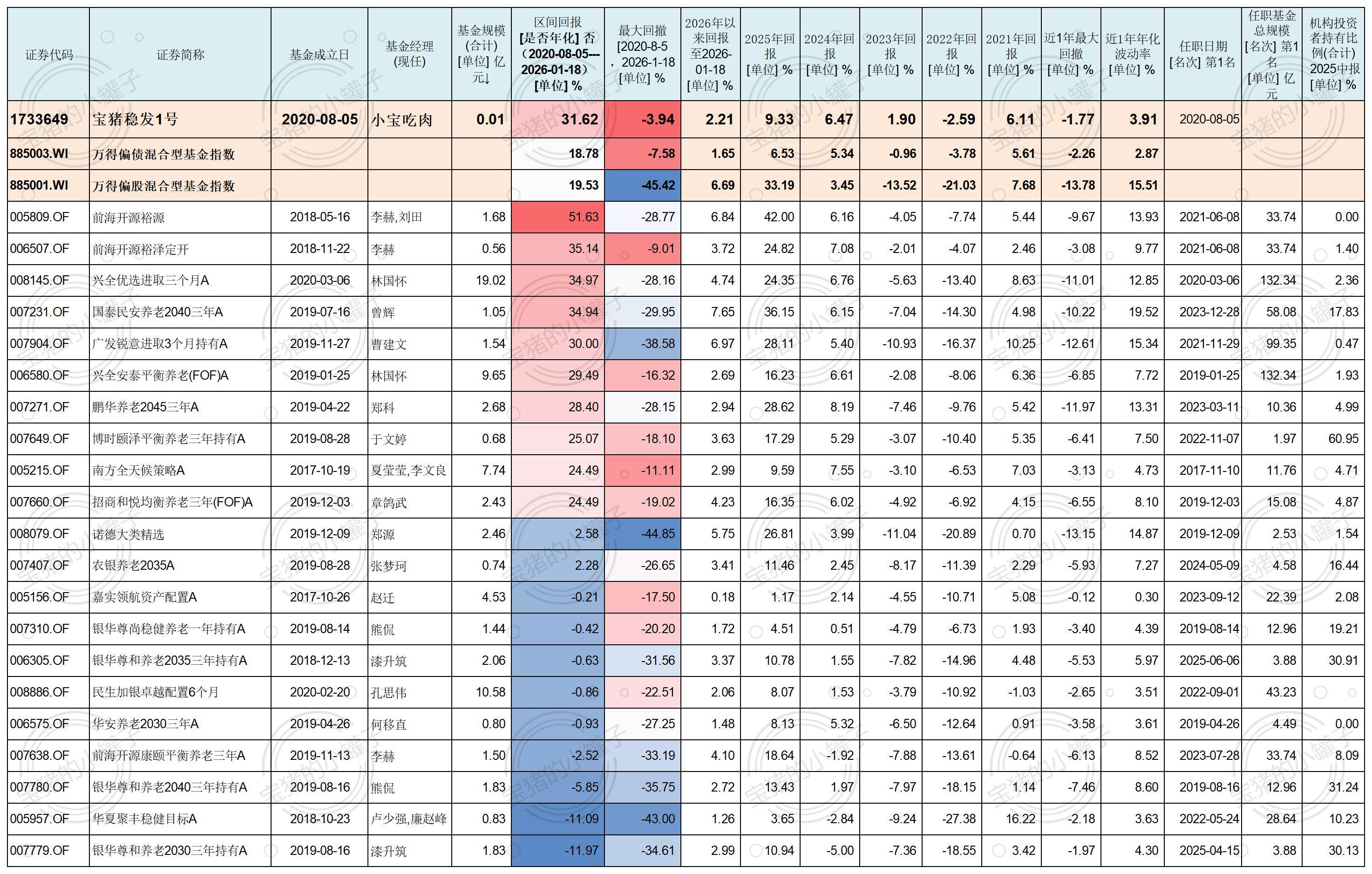 成立不晚于2020年8月5日的公募FOF有107只(这半年倒没有清盘的FOF,得益于牛市带来的业绩回升吧),终于有5只FOF同期收益率高于30%了(2020.8.5-2026.1.18)!