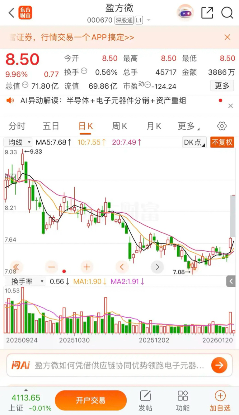 盈方微今日复牌涨停收盘报收8.50元每股,低价低价半导体科技股,成交金额3886万元,未来10倍股,目前总市值71.80亿元。