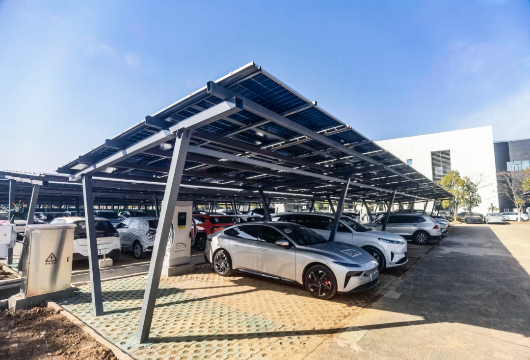 该光储充一体化示范项目,覆盖光伏、储能、充电三大单元:光伏系统充分利用园区内混凝土屋面、彩钢瓦屋面及定制化单立柱与V型车棚,实现空间集约化发电;储能单元在发电高峰时储电,在用电高峰时放电,增强供电可靠性并优化用能成本;充电系统则整合新建直流快充与交流慢充桩,并对园区既有各品牌充电桩完成智能化改造与统一接入,构建了全面覆盖、便捷高效的绿色充电网络。