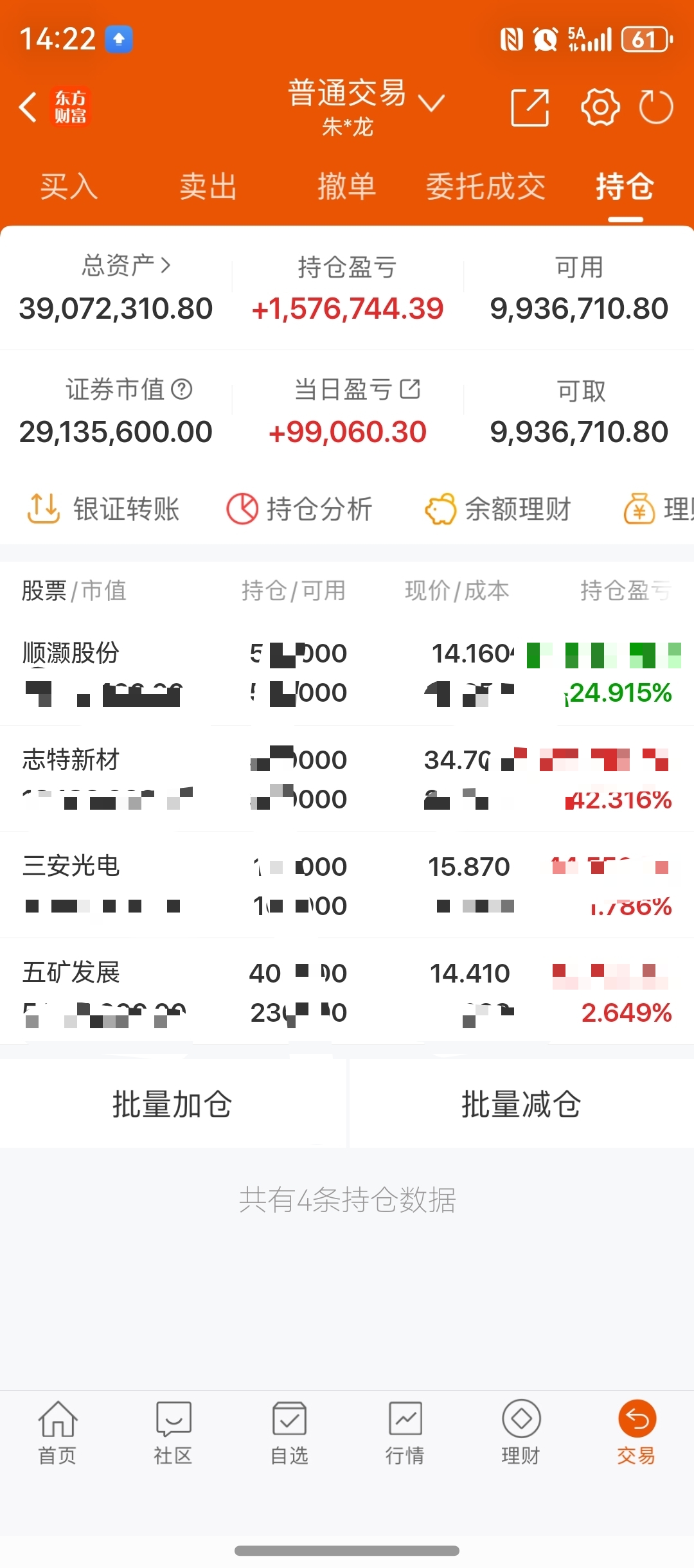大家下午好,刚到家,来迟了!还是老样子,今日补了点仓。目前手持:顺灏股份:唉,待修复。既然到了这一步,就想等到监管结束看情况了。$志特新材(SZ300986)$ 今日冲高回落,在均线附近震荡。强者从不抱怨环境,持有看。$五矿发展(SH600058)$ 早盘没能及时踢走,看来还是起了点贪念。看它走势还行就拿着看吧。$三安光电(SH600703)$ 跟着主力布局,情况良好,回调修复的不错,趋势逐渐明朗。接着持有。