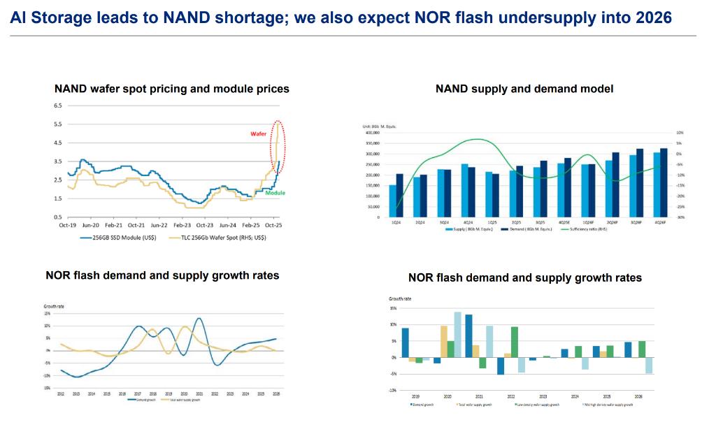 SK海力士和三星被列为首选,其上涨潜力分别达到13%和14%。这一判断基于两者在HBM市场的主导地位以及整体商品周期的改善。与此同时,NAND市场也迎来了由AI推理需求支撑的“超级周期”。闪迪公司和KIOXIA因其在企业级SSD领域的潜力而被看好。分析显示,AI存储需求导致NAND出现短缺,甚至NOR Flash的供应不足也可能持续至2026年。