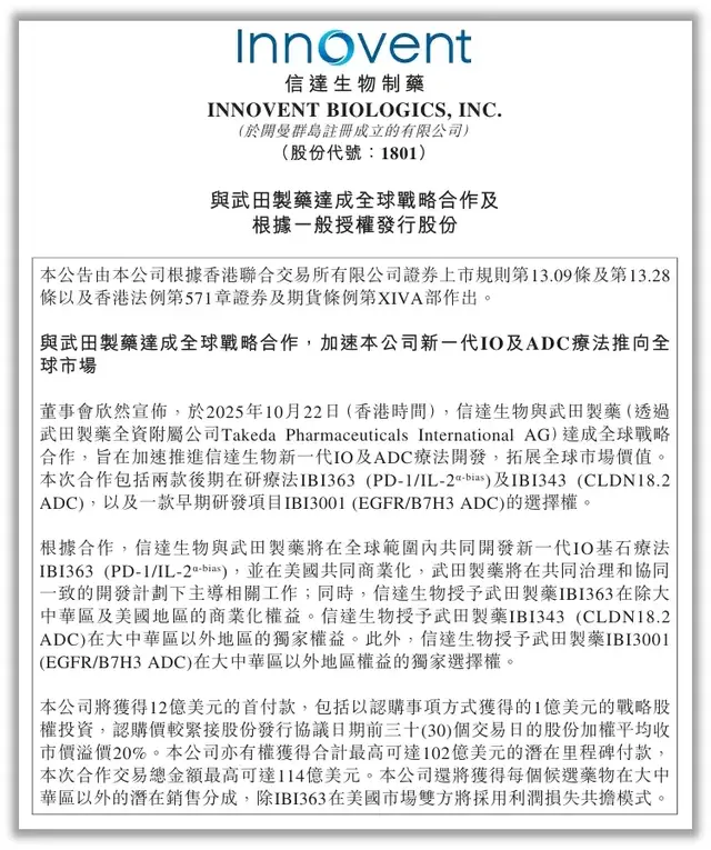 10月,信达生物再度抛出了重大利好消息。10月22日,信达生物与日本武田制药达成全球战略合作,总金额高达114亿美元,其中包括1亿美元的战略股权投资。该协议涵盖IBI363(PD-1/IL-2双特异性抗体)和IBI343(CLDN18.2抗体偶联药物),武田将在美国与中国共同开发和商业化,并在全球其他地区独家负责。