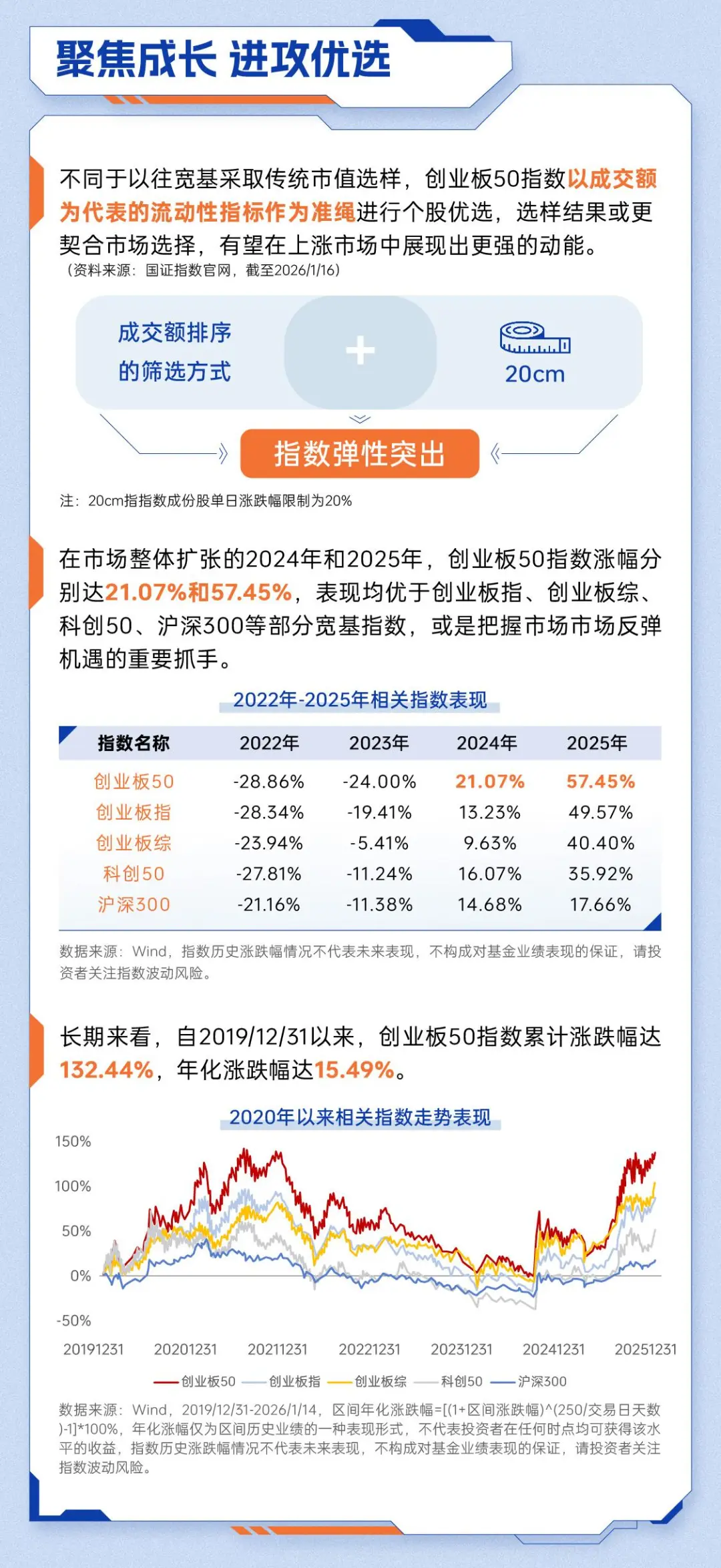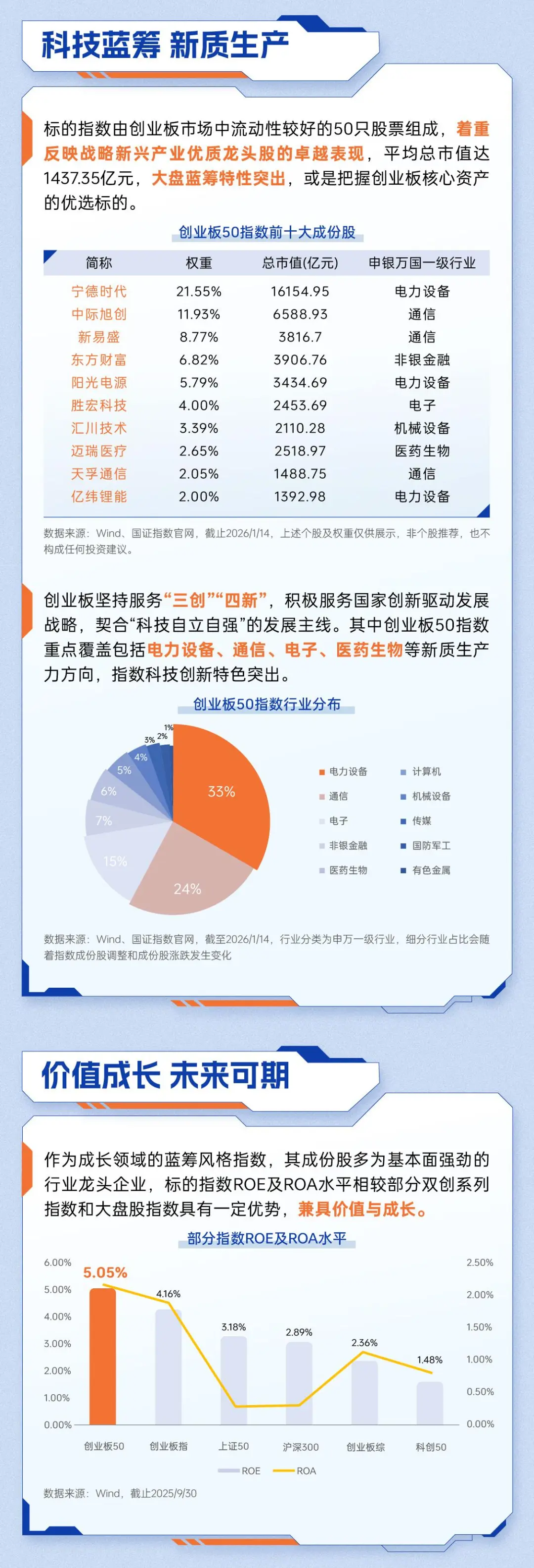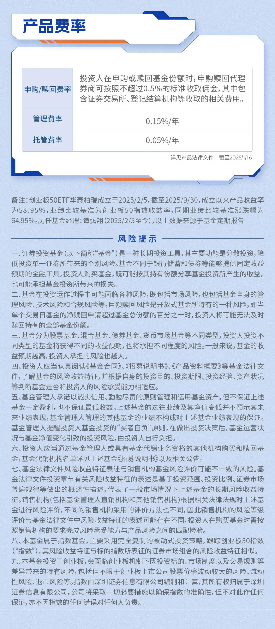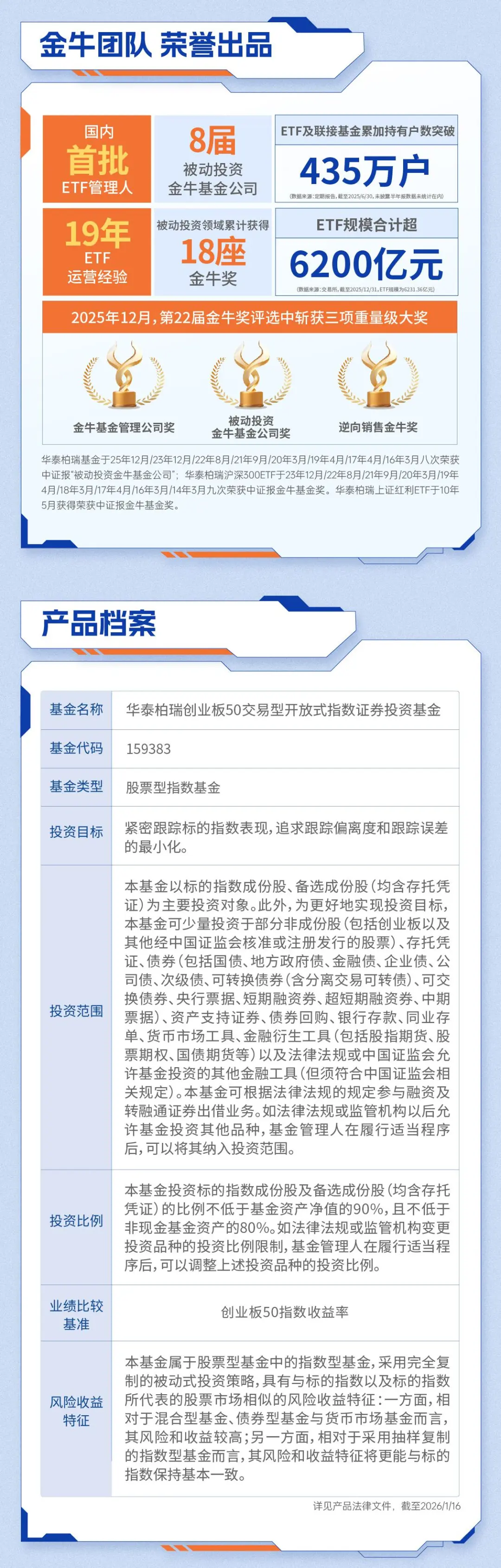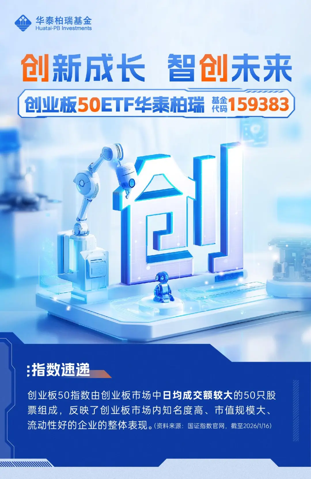 创业板50指数由创业板市场中日均成交额较大的50只股票组成,反映了创业板市场内知名度高、市值规模大、流动性好的企业的整体表现。(资料来源:国证指数官网,20260121)$创业板50ETF华泰柏瑞(SZ159383)$