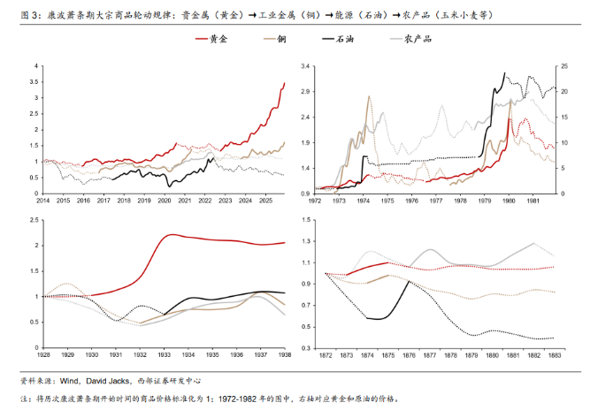 逻辑二:康波萧条期,按照商品周期的轮动规律,石油板块值得关注!康波萧条期,美元信用裂痕扩张,大宗商品的货币属性和安全属性得到增强,商品的超级周期启动!西部证券指出,商品超级周期并不代表商品价格同步共振,而是呈现出鲜明的“属性递进”式轮动,黄金率先上涨,工业金属(铜)紧随其后,能源(原油)上涨略微滞后,农产品往往最后上涨。能源(原油)在本轮商品超级周期中相对滞涨,后市值得重点关注。
