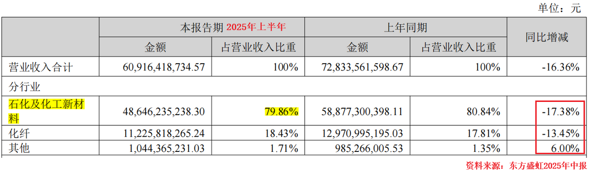 截至2025年上半年,“石化及化工新材料”仍然是公司最大营收来源,总营收占比高达79.86%。