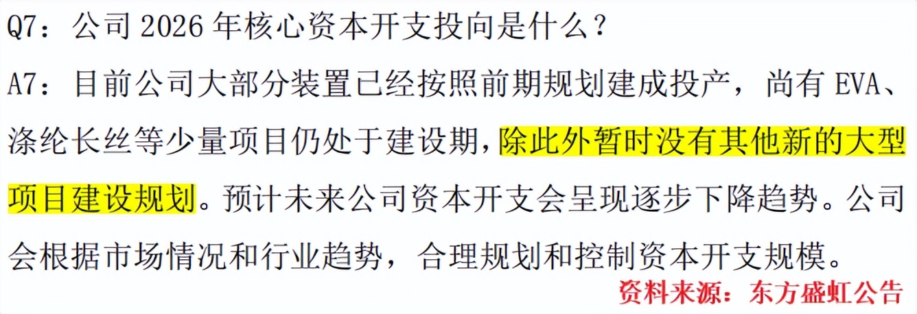 对此,公司2026年1月曾公开表示,目前其大部分装置已基本投产,只有少量项目处于建设期,预计未来其资本开支会逐步下降。“守住钱袋子”之后,东方盛虹有望进一步提升其财务水平。