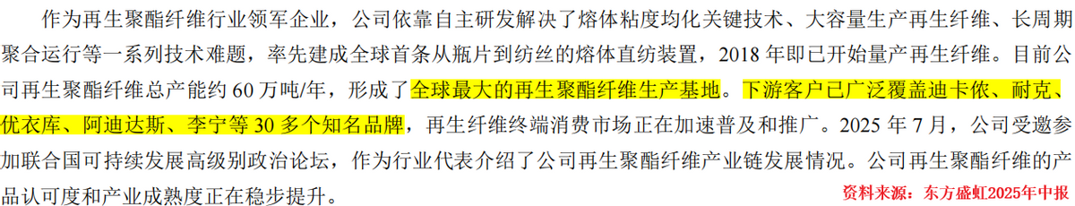东方盛虹快人一步,2018年就开始量产再生聚酯纤维,目前再生聚酯纤维年产能60万吨,坐拥全球最大的再生聚酯纤维生产基地,覆盖迪卡侬、耐克等国内外大客户。