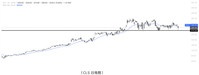 CLS 在高位进行技术性回踩与换手。只要 270 支撑不被有效跌破,调整应视为中期布局窗口而非风险信号;后续若重新站回 EMA20 并企稳,股价有望回到震荡上行节奏,等待基本面催化再次发力。