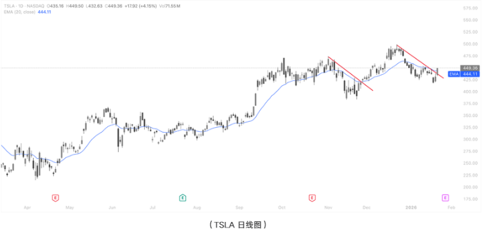 消息面方面,特斯拉 CEO 马斯克在达沃斯释放密集利好,从人形机器人 Optimus、Robotaxi 商业化到 AI 与太空探索,系统性强化了“AI + 机器人 + 自动驾驶”的长期增长叙事。Optimus 已进入工厂实用阶段并有望明年底对外销售,Robotaxi 在美国的无监督测试推进,显著提升了市场对其第二、第三增长曲线的预期,成为推动股价走强的核心催化。