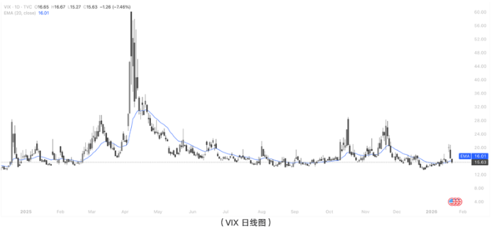 从日线结构看,VIX 在前期情绪冲击高点后持续回落,目前重新贴近 16 一线并运行在 EMA20 附近,显示市场恐慌情绪已明显降温。当前波动率处于历史偏低区间,尚未出现快速抬升的迹象,意味着资金并未对系统性风险进行重新定价。只要 VIX 维持在 16–18 区间内震荡,权益市场仍具备维持反弹与结构性做多的环境;只有当 VIX 再度放量上行并有效站上 20,才需要对风险偏好转向保持更高警惕。