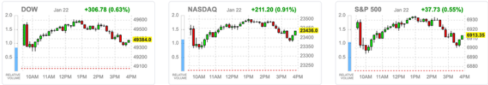 产业与公司层面亮点频出:马斯克在达沃斯释放重磅信号,特斯拉人形机器人 Optimus 有望明年底面向公众销售,Robotaxi 商业化进程提速,股价显著走强;SpaceX 被曝为潜在 IPO 接洽多家顶级投行,估值体量引发市场关注;阿里巴巴据称推进 AI 芯片子公司平头哥独立上市,提振中概科技情绪并带动股价上行;加密领域迎来 2026 年美股首个 IPO,风险偏好外溢至数字资产相关标的。