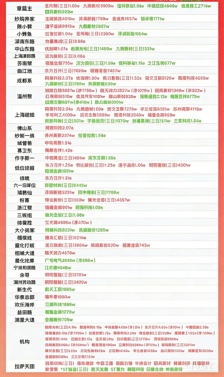 - 对于投资者而言,可重点关注章盟主、炒股养家等一线游资共同介入的标的,这类个股往往具备更强的持续性;同时需警惕拉萨天团扎堆的个股,避免追高情绪退潮后的大幅回调。