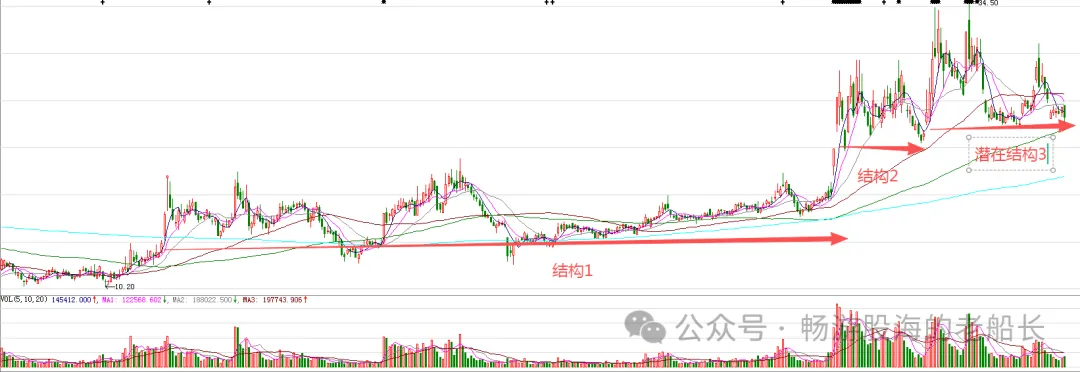 图中标注的大型中枢结构1突破,意味着股价处在大型的上涨趋势。结构2是结构1突破后的回踩,意味着后期有波段上涨。结构3是结构2突破后的回踩,意味着波段上涨不远了。接下来,股价随时会企稳,大概率开启新的波段上涨。