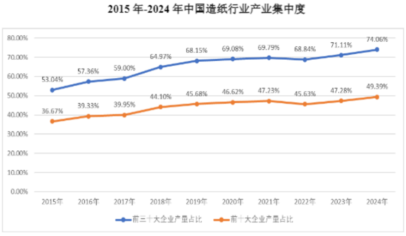 从产业集中度看,2015年至2024年,前10名造纸企业产量占比从36.67%提升至49.39%,前30名企业产量占比从53.04%攀升至74.06%,行业资源加速向头部企业集聚,规模化、集约化发展态势凸显。
