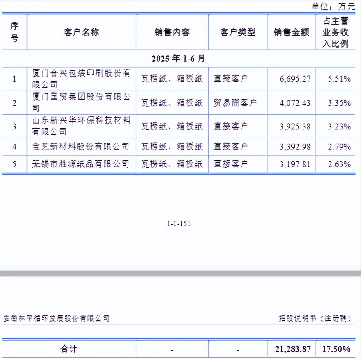 经过二十余载在造纸行业的深耕,林平发展已积淀深厚的品牌影响力,与国内众多知名企业均建立起长期稳定的合作关系。招股说明书显示,公司2025年上半年的前五大客户包括合兴包装、厦门国贸、山东新兴华、宝艺股份以及无锡胜源,其中合兴包装、厦门国贸均为A股上市公司;且各客户销售金额占比均低于6%,表明公司客户结构分散合理,不存在对单一客户的重大依赖,有效保障了经营业绩的稳定性与可持续性。