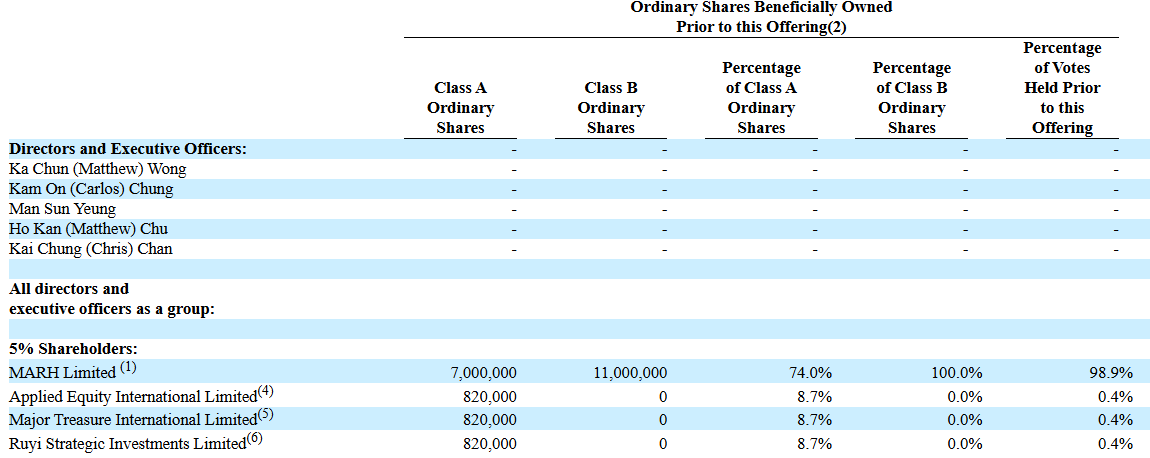 IPO前,Ho Wai (Howard) Tang持有74的A类股和100%的B类股,拥有98.9%的投票权。Hak Keung Andy, Sung、Kai Kit Joe, Poon、Fung Ting Yuen各持有8.7%的A类股,分别拥有0.4%的投票权。