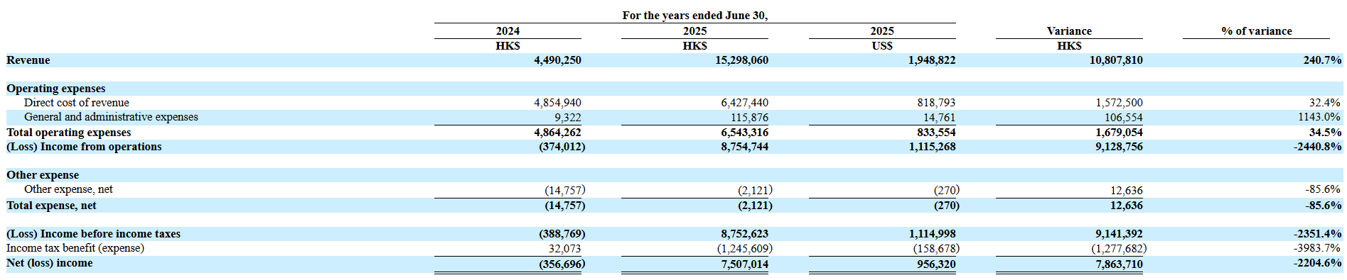 2024至2025财年(截至6月30日),龙跃资本营收分别为449万港元、1530万港元(约195万美元),相应的净利润分别为-36万港元、751万港元(96万美元)。