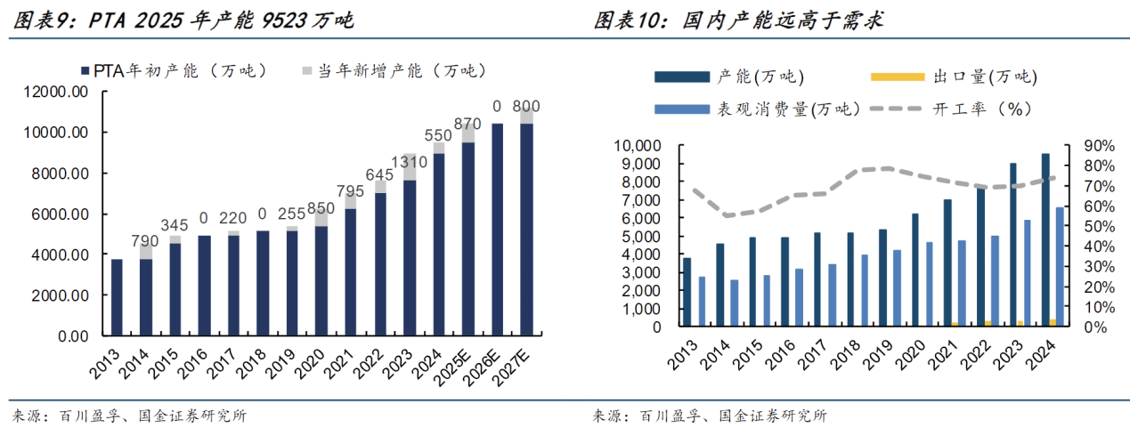 PTA2024年产能达到9523万吨,而表观需求量只有6557万吨,开工率为73.48%。根据百川盈孚,过去12年PTA平均每年产能增加524万吨,平均增速9%,略高于需求平均增速8%。未来预计还有1170万吨产能的增量,到2027年整体PTA产能将达到亿吨级别。此外,为了消化国内过剩产能,2022年后国内PTA出口量开始增加,2021年出口增速高达204%,2022-2024保持平均20%增速。