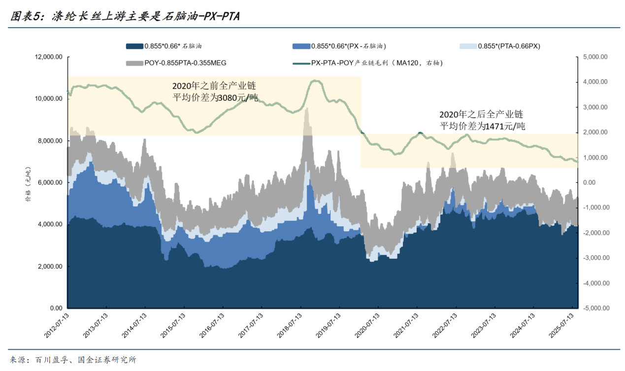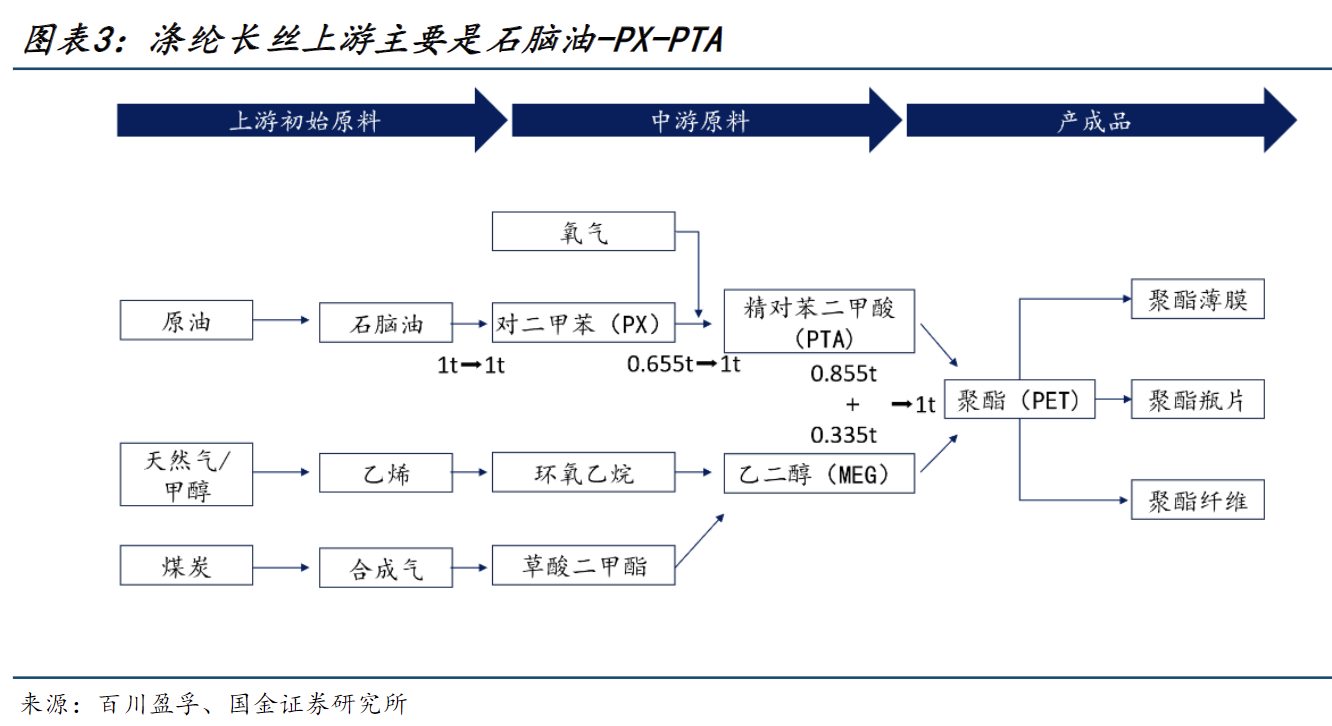 涤纶长丝上游原材料主要有PX、PTA、MEG,下游应用于织造纺服行业。涤纶长丝产业链上游以原油裂解出的石脑油制PX,经氧化精制成PTA;同时乙烯路线或煤制路线产出MEG;中游将约0.855吨PTA+0.335吨MEG聚合得1吨PET熔体,采用连续聚合直纺生产POY/FDY/DTY等涤纶长丝,下游进入织造、染整与服装家纺等。需要注意的是,此处的原料消耗系数主要参考百川盈孚采用市场默认平均值,实际物料消耗情况会根据企业工艺路线优化和一体化规模效应有所变动。