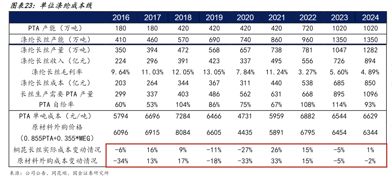 从另一方面来讲,对于上游产业链的覆盖能够实现相关材料自主可控,稳定公司整体生产和经营活动,平滑涤纶长丝生产成本曲线。我们拆分了桐昆过去10年的长丝单吨成本,观察到桐昆涤纶长丝实际成本波动远低于原材料外购成本。通过覆盖上游产业链,桐昆有效降低原材料价格波动对生产经营的影响,从而实现更稳定的运营。