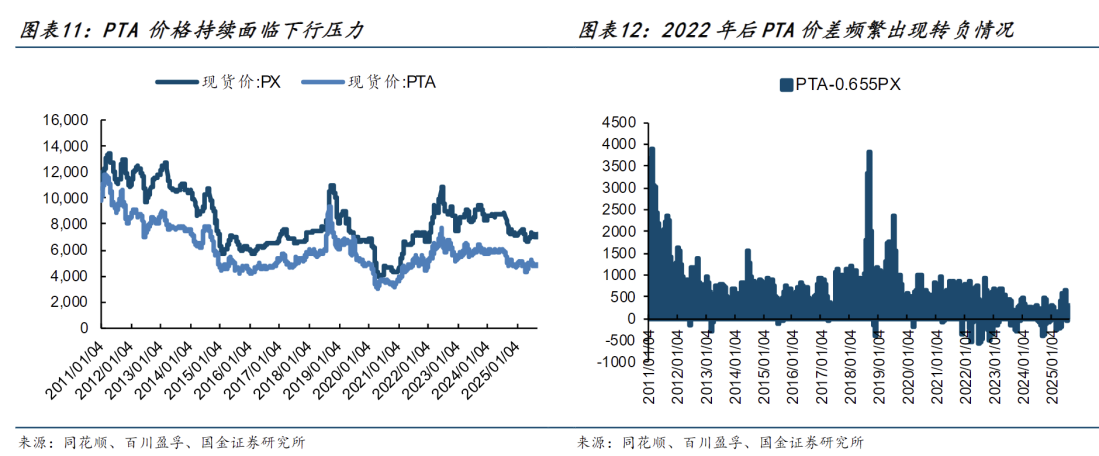 PTA需求和产能投产错配,周期特征导致价差波动幅度较大。根据百川盈孚,PTA价格峰值出现在2013年、2018年和2022年,随后产能大幅投放带来价格下跌,周期性特征导致PTA价差波动极大,高点在2011年可以达到3571元/吨,低点在2023年可以低至-307元/吨。目前国内PTA产能严重过剩导致价差持续收窄,2023年后价差基本在500元/吨以下,价差分位数在6.5%低位,随着未来产能继续投放,价差仍面临较大下行压力。