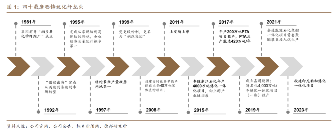 四十载风雨磨砺,铸就全球化纤航母。公司前身是成立于1981年的桐乡县化学纤维厂,90年代初通过“借船出海”引进涤纶纺丝生产线,成功实现了从丙纶长丝到涤纶长丝的转型升级,随后在亚洲金融危机中完成低成本逆势扩张,涤纶长丝产量跃居国内第一。2011年公司成功在上交所上市,加速全产业链布局步伐,2015年参股浙石化,2017年投产嘉兴石化二期PTA装置,2023年与新凤鸣合作出海投建炼厂,持续扩大一体化竞争优势。