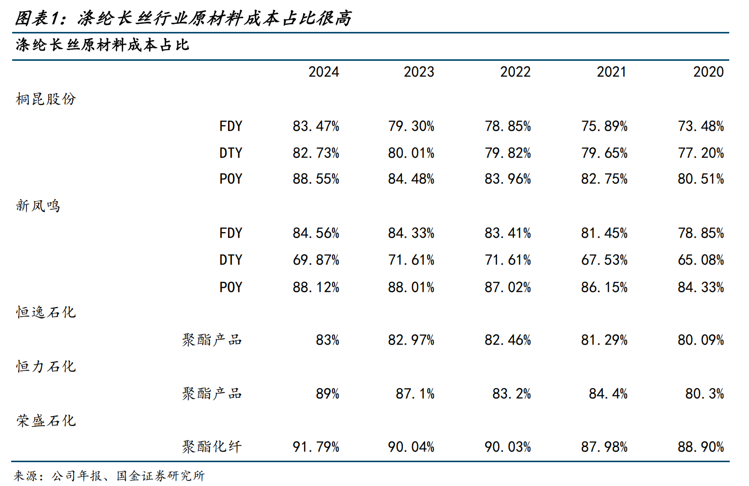 涤纶长丝产业链利润变动主要看供给侧投放节奏,综合来看行业短暂承压后将迎来拐点。从历史数据来看,涤纶长丝行业原材料成本占比基本均在70%以上,在极端原油价格行情下,主要公司归母利润会有较大波动,但从长期来看,产业链利润受中下游供需格局影响更大,尤其是供给侧产能投放节奏。