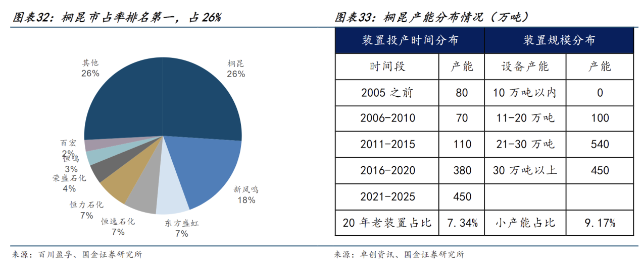 桐昆在出清行情中会有极大收益。从产能格局来讲,涤纶长丝行业集中度较高,2025年CR3达51%。其中,桐昆市占率排名第一,产能占26.3%;从桐昆自己的产能分布情况来看,20年老旧装置产能占比为7.34%,小产能占比为9.17%,均远低于行业平均水平,在出清行情中会有更大的收益。