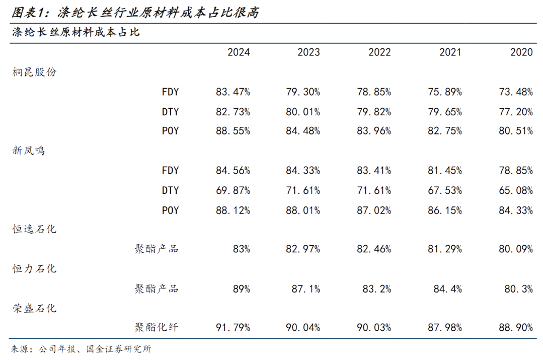 原材料成本是行业利润的决定性因素。从历史数据来看,涤纶长丝行业原材料成本占比基本均在75%以上,是行业利润的决定性因素,在极端原油价格行情下,主要公司归母利润会有较大波动,2022年上半年原油价格从2021年末80美元/桶,涨至113美元/桶,主要涤纶长丝公司下半年利润转负,环比大幅下滑,个别公司跌幅达两倍以上。因此,涤纶长丝行业利润重点在于上游原料的价格预期走势。