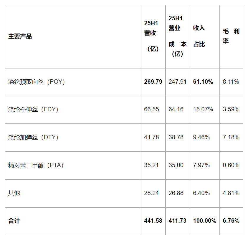 涤纶长丝:这是公司收入和利润的最主要来源。产品覆盖POY、FDY、DTY等六大系列上千个品种,被称为“涤纶长丝企业中的沃尔玛”。截至2025年上半年,公司拥有1350万吨长丝产能,市占率位居全球第一。其中,涤纶预取向丝(POY)是过去三年收入占比最高的业务。