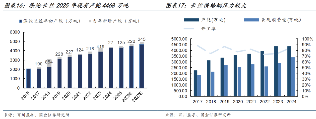 老产能和小产能存在出清风险,供给侧改善空间大。老产能和小产能因性价比存在出清风险。以时间口径统计,参考卓创资讯数据涤纶长丝行业20年前老旧产能有634万吨,占比12.95%,考虑到未来2026-2027年有465万吨产能投放,如果老旧产能全部出清,供给侧将会有169万吨产能出清,有效缓解供需压力;从另一个角度来看,由于规模效应确实能带来较为明显的利润优势,小产能装置也有替换和出清的可能,当前设计产能20万吨以内的装置产能总计1401.2万吨,占比达30%,从该角度来看,供给侧存在更大的改善空间。