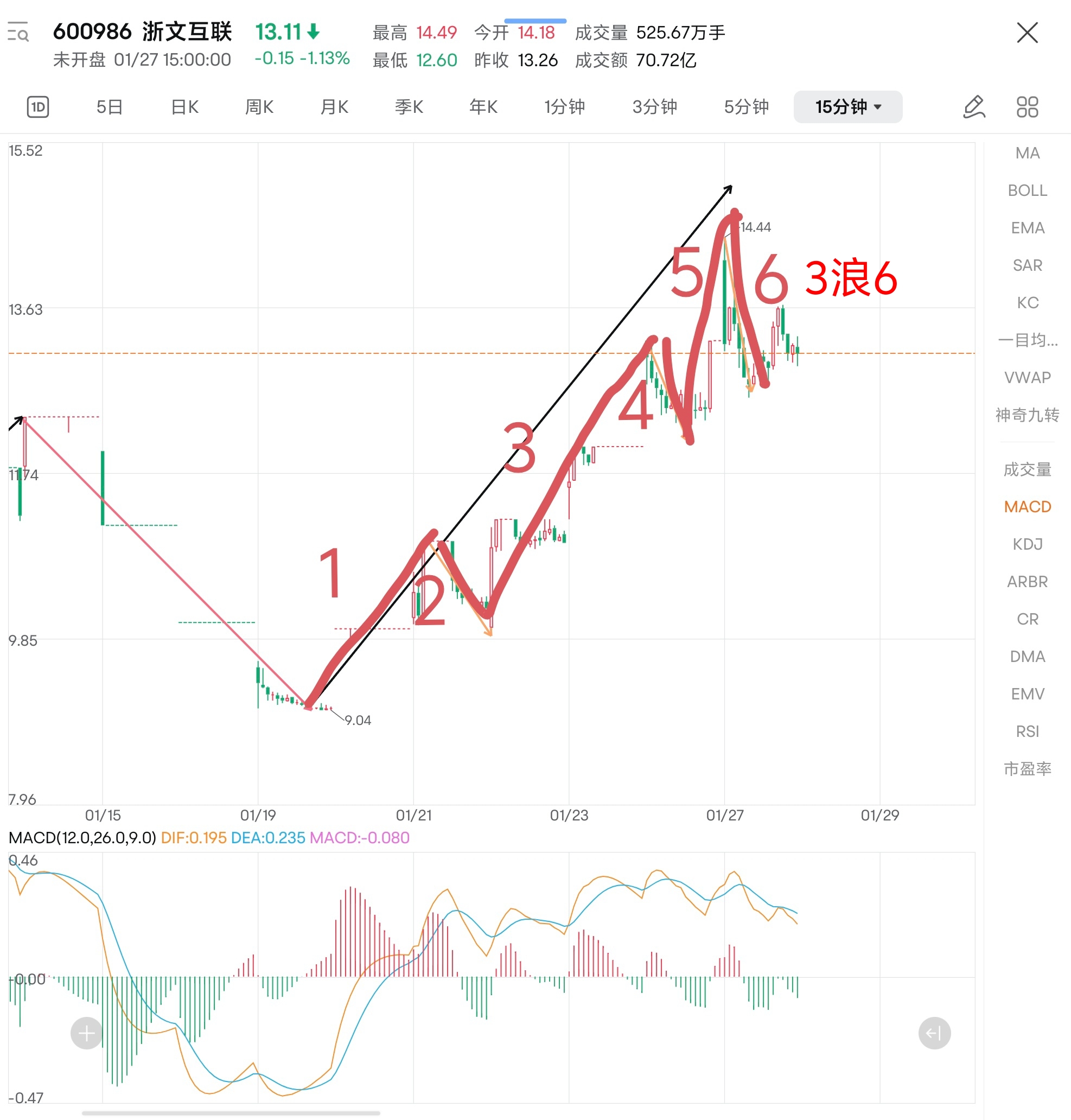 1月7日放量启动1浪上涨,3个板打到12.39元后3个地板,走2浪回调(60分钟回调),1月20日强势上板启动3浪上涨,打到今天最高点14.49元走3浪6下跌(5分钟回调),这里要明确3浪5已经背驰走弱,如果明天跌破3浪6低点12.61元,3浪6将会升级为15分下跌,即结束3浪上涨,形成大4浪下跌。