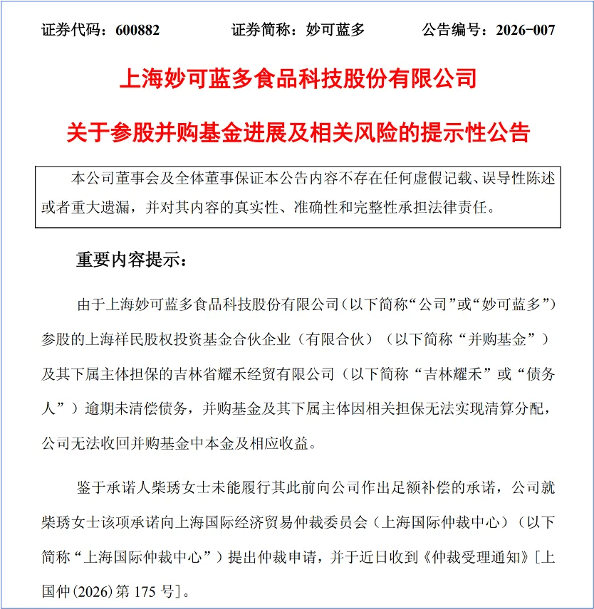 妙可蓝多2018年参股了一支股权投资基金,该基金投资的关联公司“吉林耀禾”(由柴琇关联方控制)出现了债务逾期,且债权人是蒙牛。