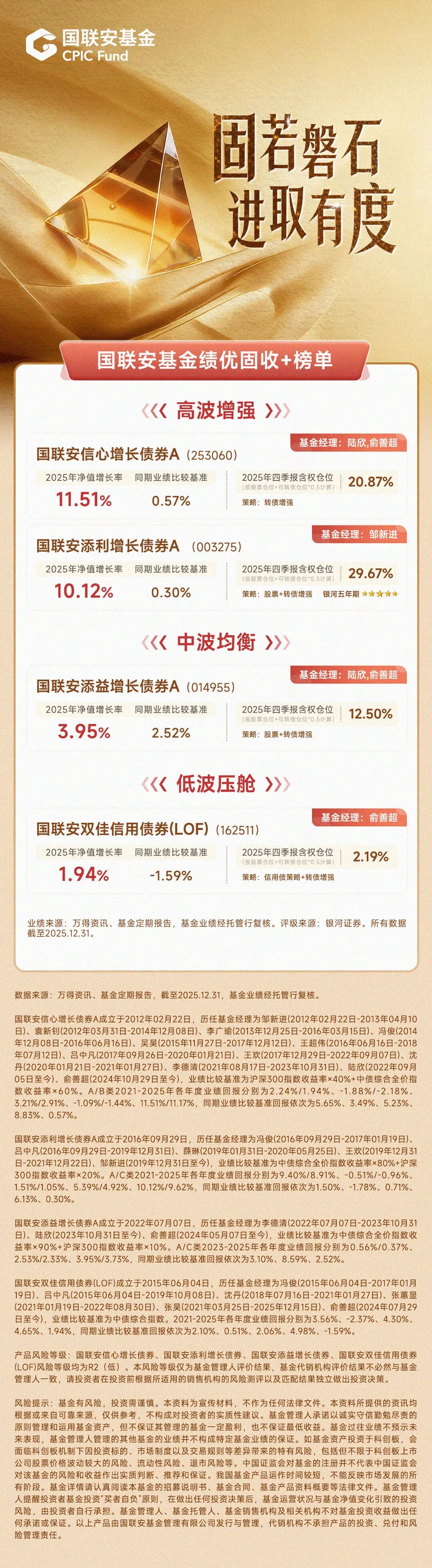 从产品生态到投资逻辑,“固收+”已从单一产品升级为系统化资产配置解决方案。无论是覆盖低、中、高波动的产品矩阵,还是“债券底仓+多元增强”的核心框架,都精准适配了不同风险偏好投资者的需求。随着四季报披露,哪些产品表现突出?