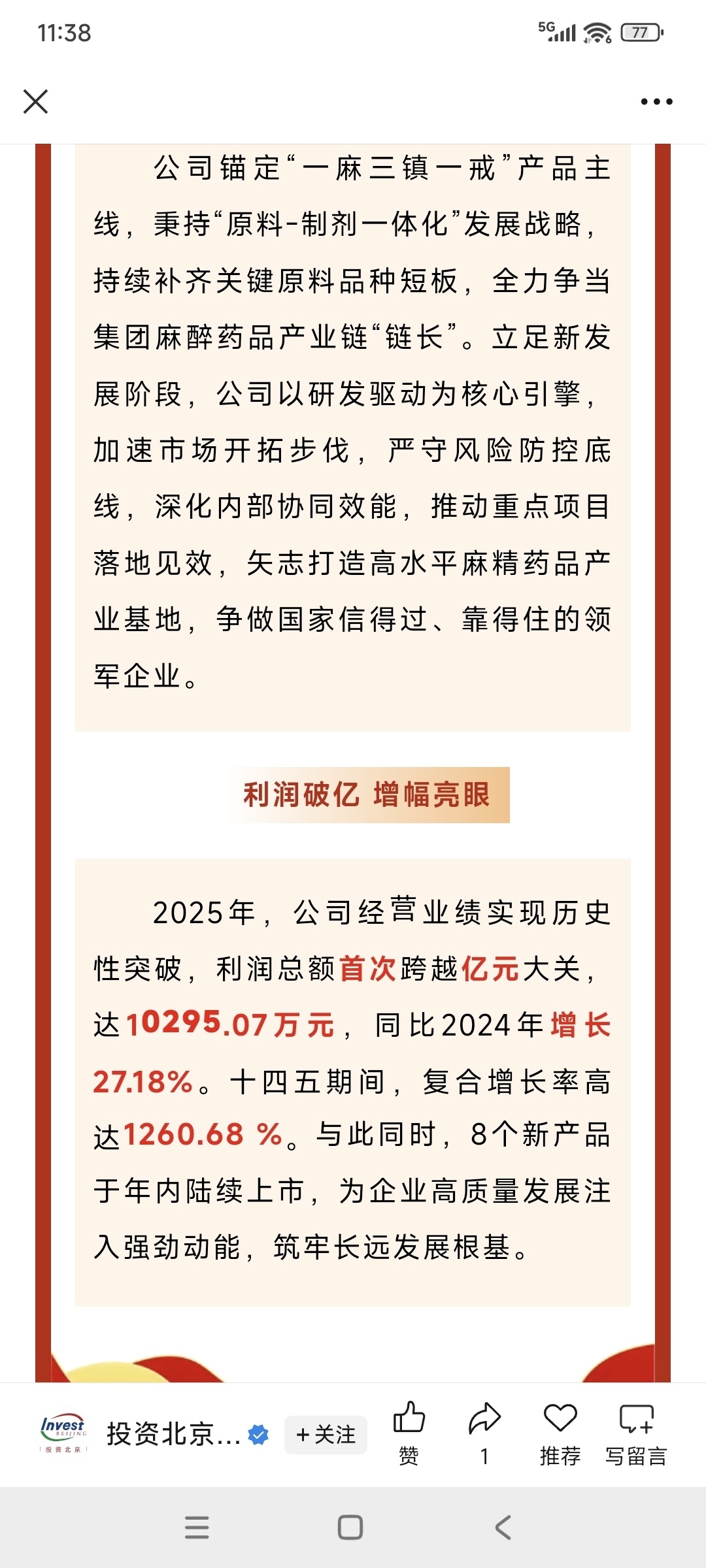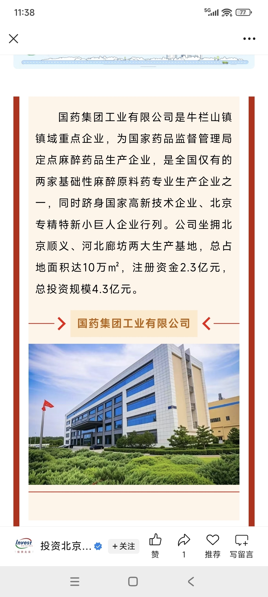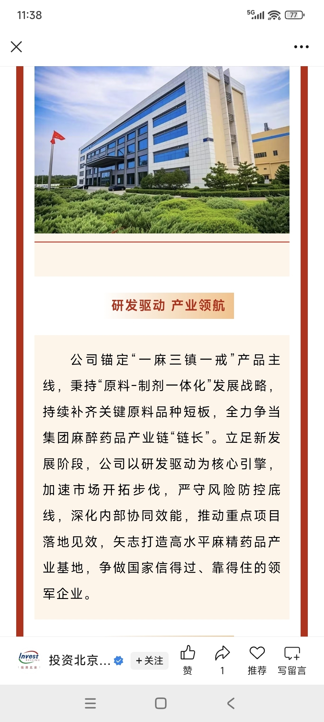 国药集团工业有限公司为国家药品监督管理局定点麻醉药品生产企业,是全国仅有的两家基础性麻醉原料药专业生产企业之一,同时跻身国家高新技术企业、北京专精特新小巨人企业行列。![发呆 [发呆]](//gbfek.dfcfw.com/face/emot_default_28x28/emot17.png)