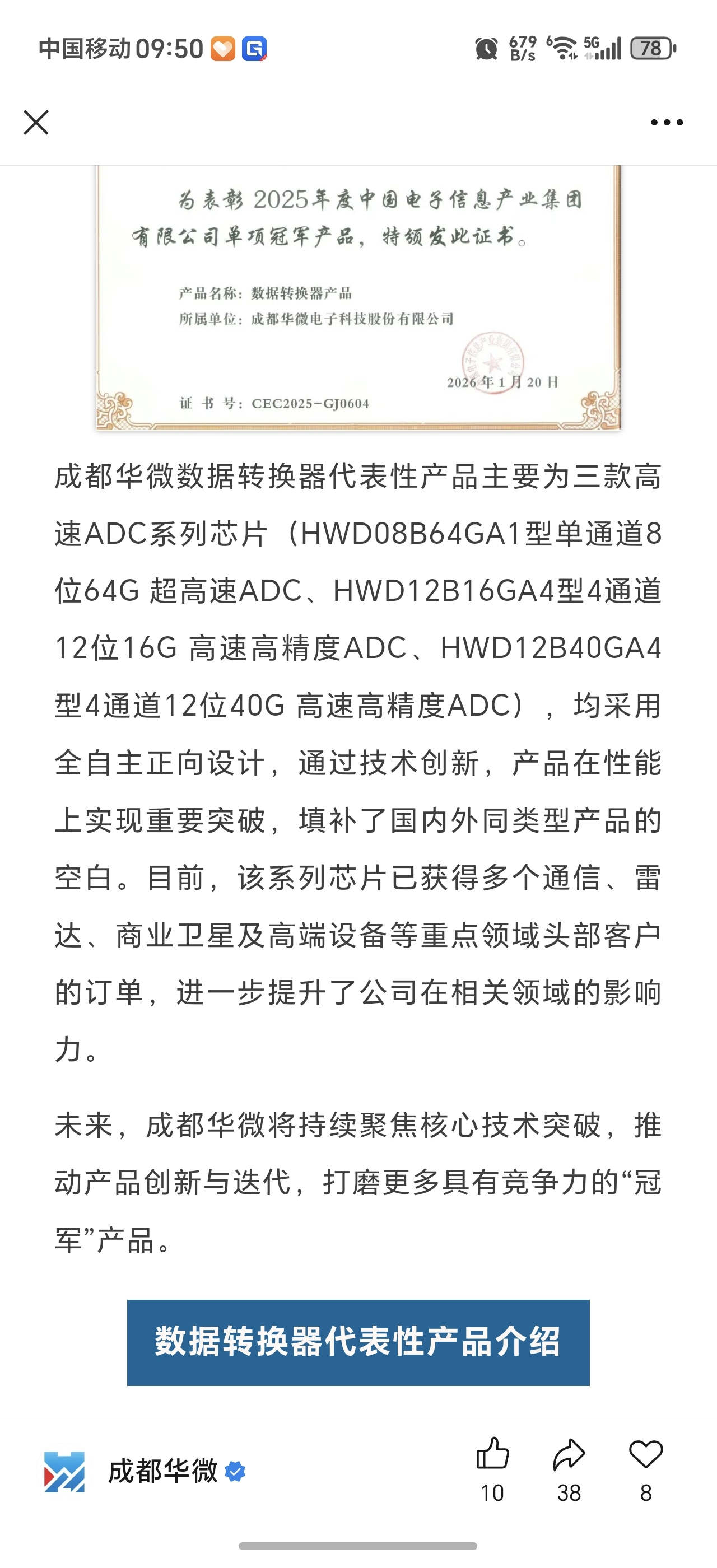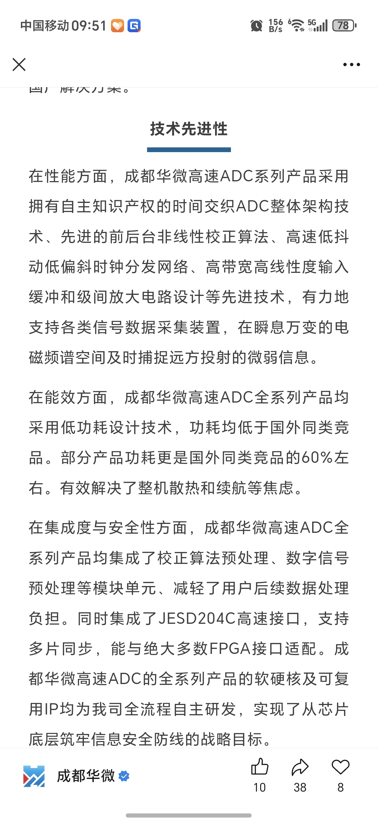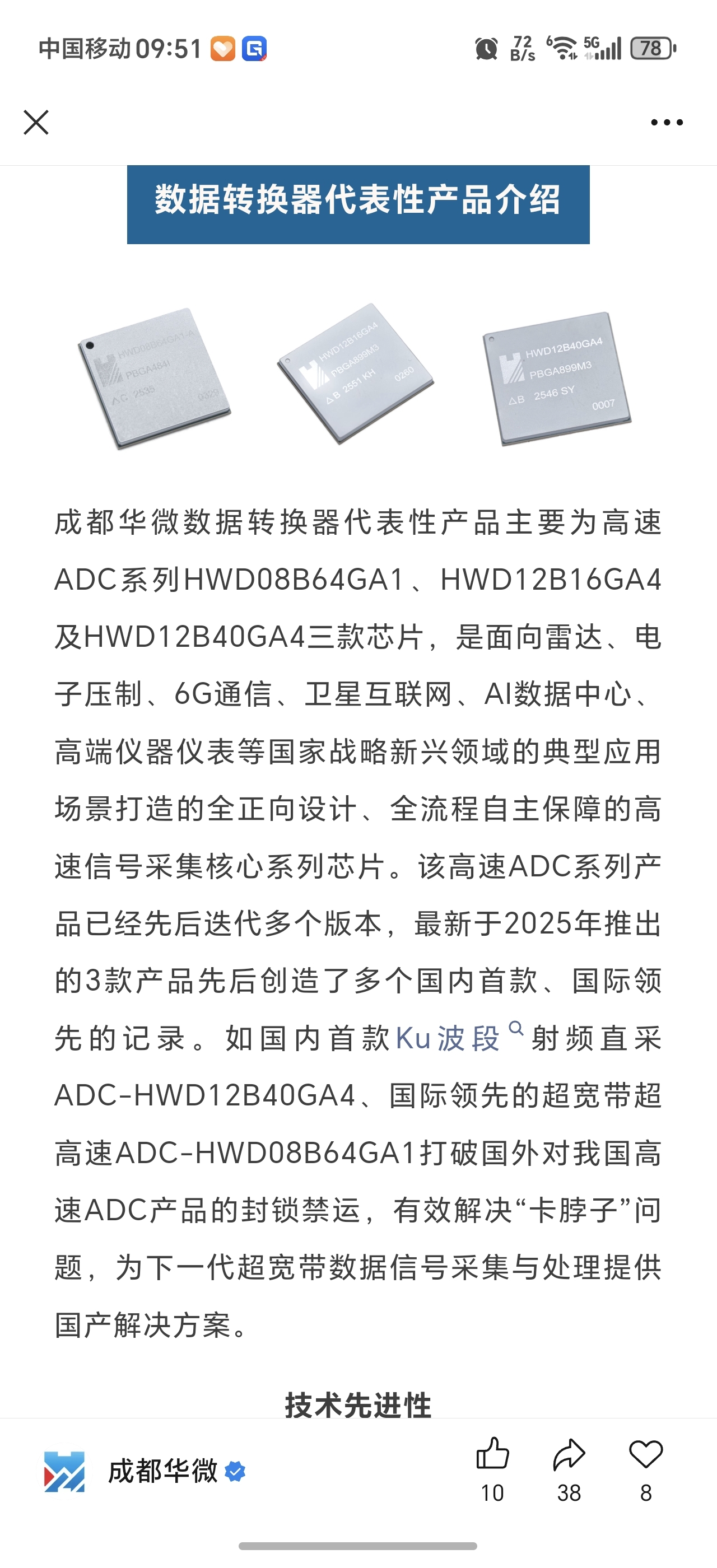 $成都华微(SH688709)$ $臻镭科技(SH688270)$ $电科芯片(SH600877)$ 成都华微公众号发布公司的ADC(高速高精度模数转换器)芯片产品成功中标1.3亿元两项国家重要项目,根据年报业绩预告的表现来看成都华微更有可能供货中国星网,因为从芯片的技术水平上来讲,成都华微的12位40 gADC芯片远超真雷科技的14位4 gADC芯片的性能,成都华为在高精度方面差了两位,但是在高速度方面却是臻镭的10倍,看年报业绩预告臻镭科技有可能只是给中国星网供货的电源芯片!